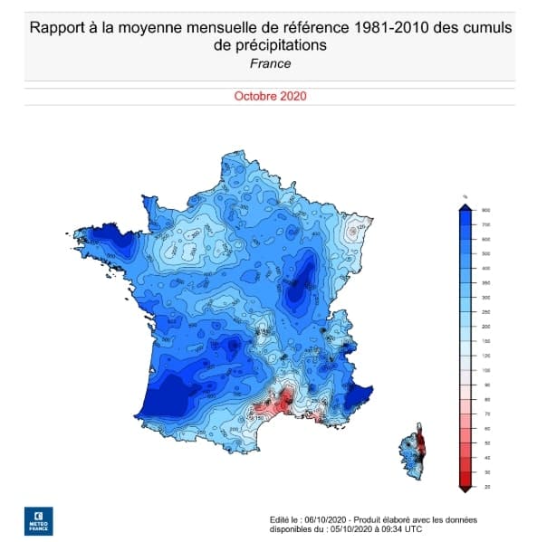 La forte humidité ambiante favorise également la création de ces gouttelettes et donc l’expansion de l’épidémie. Or, depuis la fin du mois de septembre et notamment après le passage de la tempête Alex les conditions sont très perturbées en France avec une succession de perturbations et une humidité ambiante souvent élevée. Les cumuls moyens mensuels sont en effet excédentaires sur la majeure partie du pays :