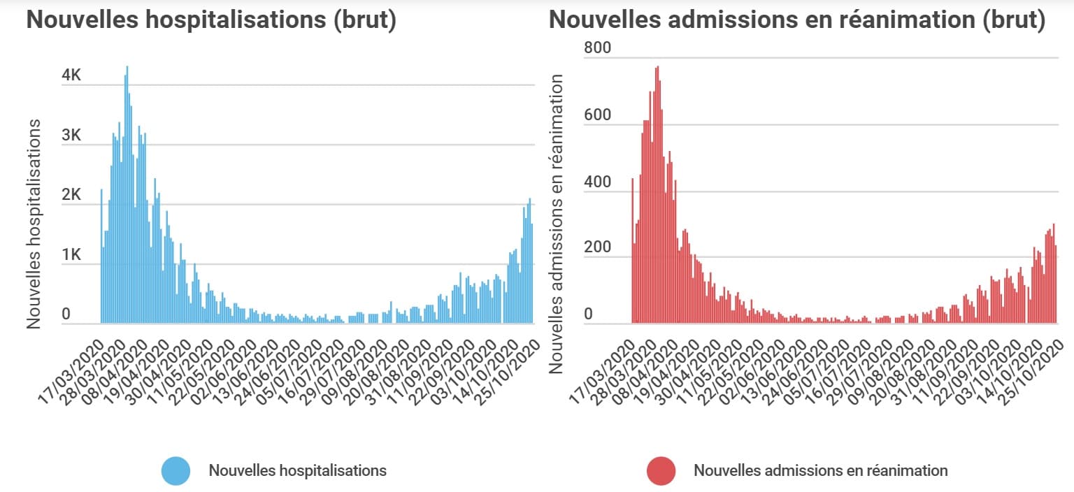 Graphiques des nouvelles hospitalisations et admissions en réanimation en France depuis le 17/03/2020 - Via linternaute