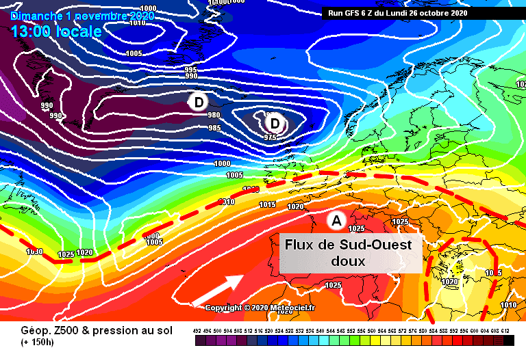 Schéma de la situation atmosphérique sur l'Ouest de l'Europe le 1er Novembre - Modèle GFS via météociel.fr
