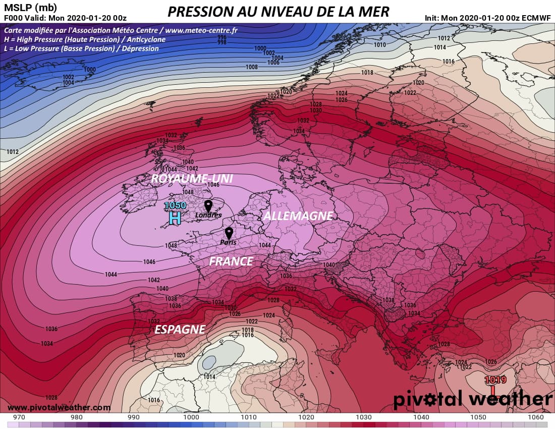 Anticyclone massif centré sur les îles britanniques le 20 Janvier 2020 - Modèle ECMWF via Pivotal Weather