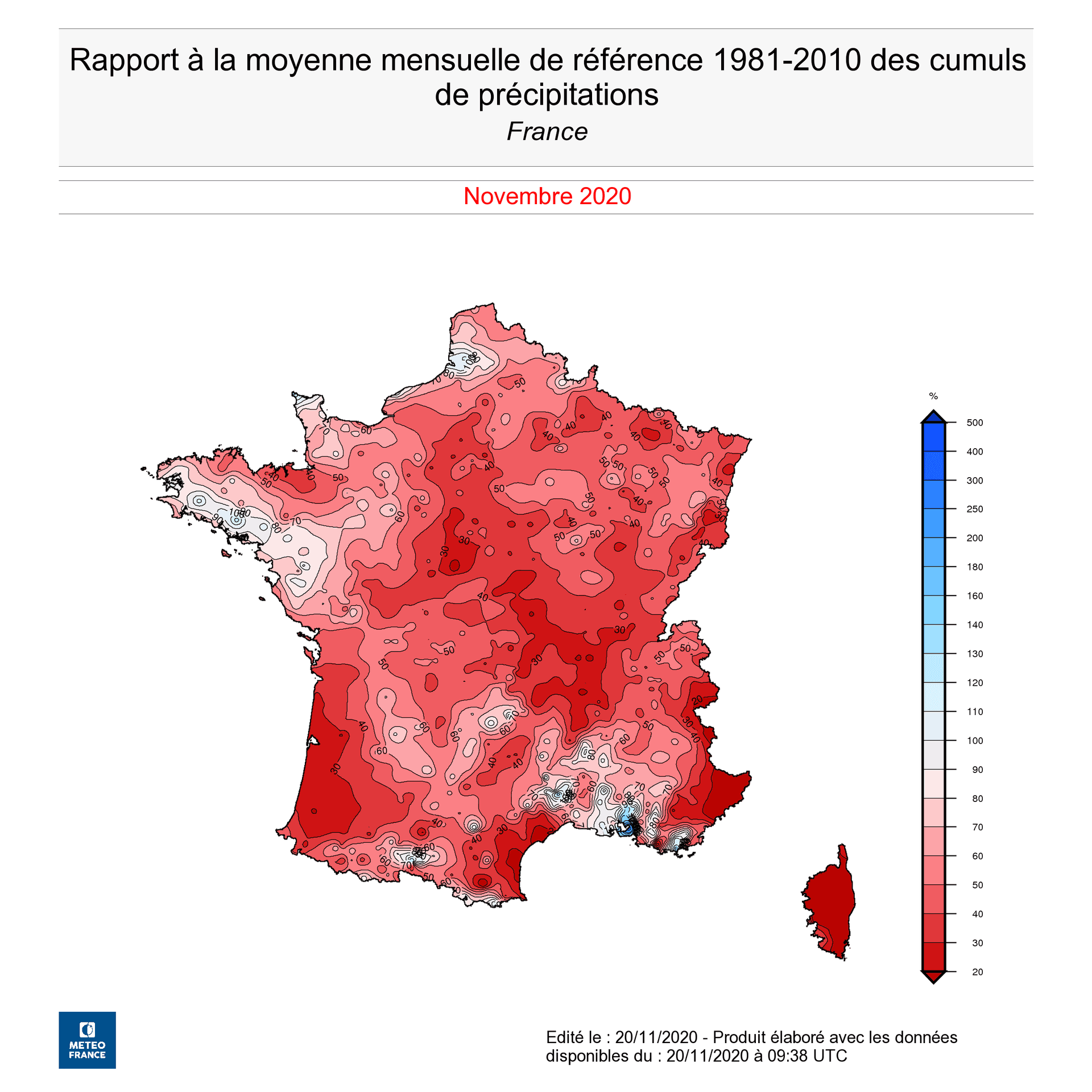 Rapport à la moyenne des cumuls de précipitations mensuels au 20 Novembre - Météo-France