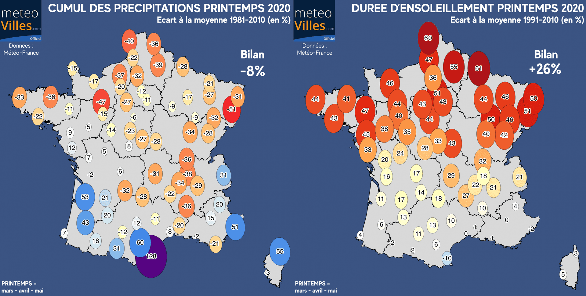 Bilans des cumuls de précipitation et de l'ensoleillement en France durant le printemps 2020 - Météo-Villes