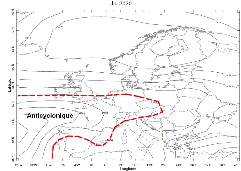Pressions moyennes sur l'Ouest de l'Europe durant le mois de Juillet 2020 - Via NOAA