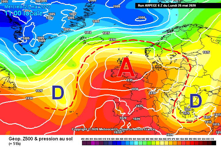 Situation classique de blocage en Oméga sur l'Europe prévue pour le Mercredi 27 mai - Modèle GFS via météociel.fr