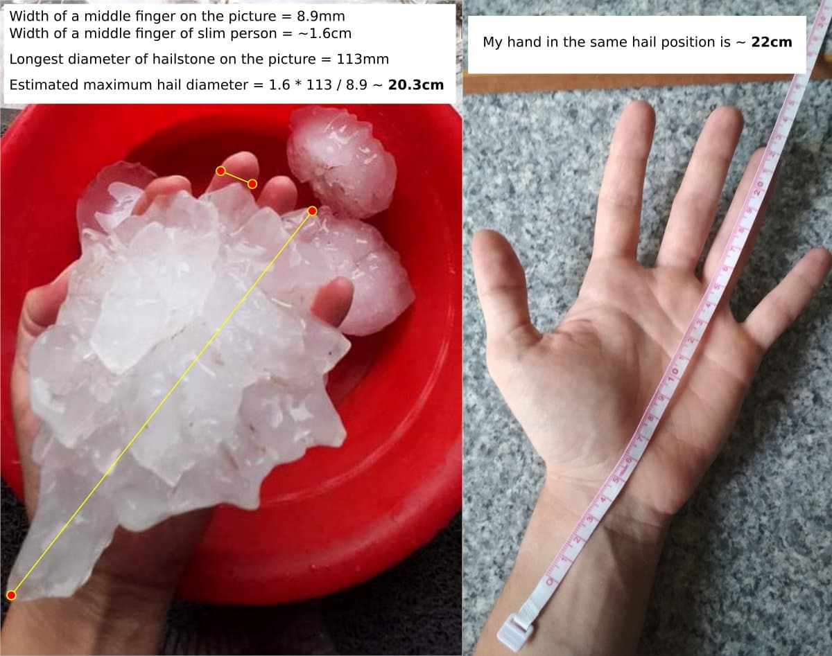 Celui-ci, outre les fortes pluies et l’activité électrique violente, a provoqué des chutes de grêlons exceptionnellement volumineux. D’après les images et les témoignages recueillis sur place, certains d’entre eux auraient pu dépasser les 20cm de diamètre (soit environ la taille d'un melon) !