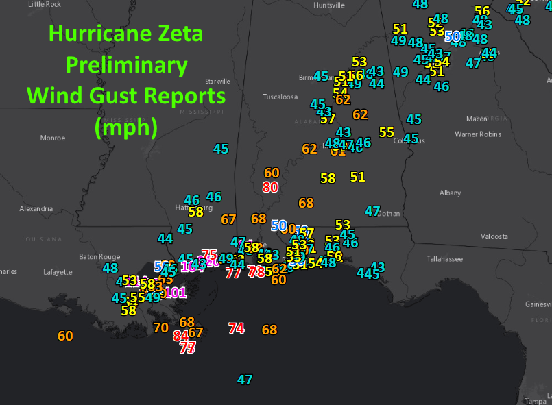 Rafales de vent maximales (en miles/hour) relevées lors du passage de Zeta sur le Sud des Etats-Unis - via National Weather Service