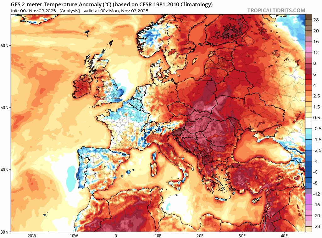 Animation des anomalies de températures à 2m sur l'Europe du 3 au 7 novembre 2025 – Via TropicalTidBits