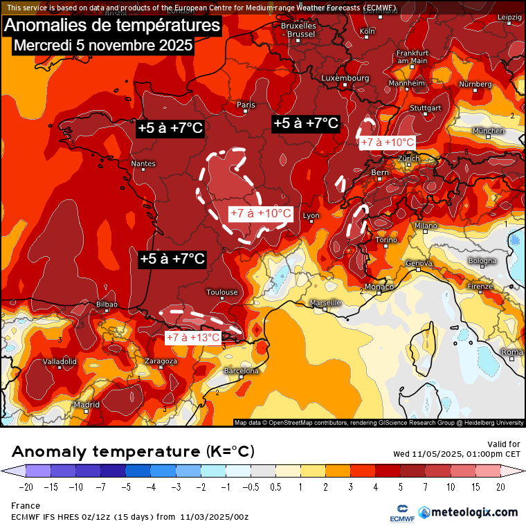 Anomalies de températures et valeurs maximales prévues sur la France ce mercredi 5 novembre 2025 - Meteologix