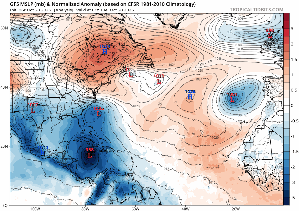 Évolution des pressions sur l'Atlantique du 28 octobre au 3 novembre 2025 – via TropicalTidBits