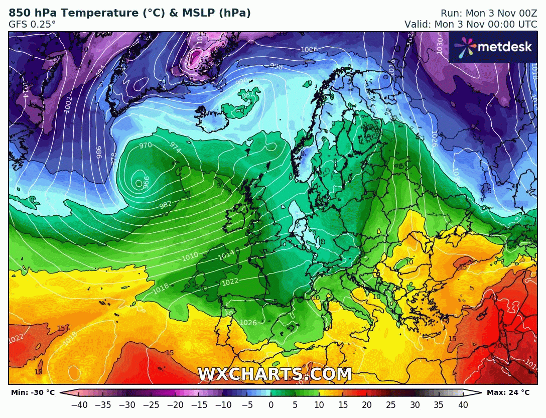 Animation des températures à 850 hPa sur l'Europe du 3 au 6 novembre 2025 – Modèle GFS via WX CHARTS