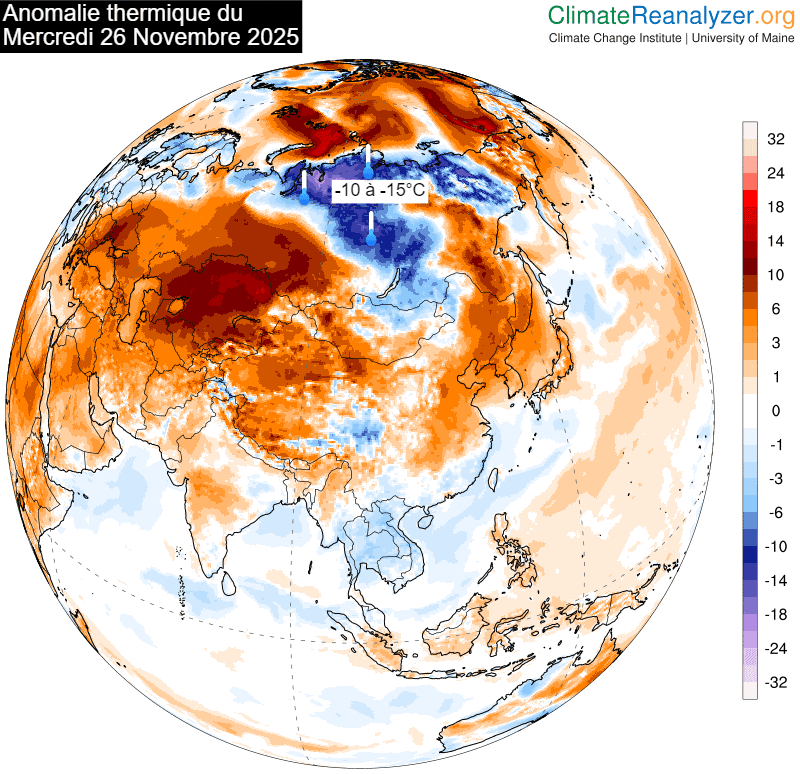 Écart à la normale des températures ce mercredi 26 novembre 2025 - climatereanalyser.org