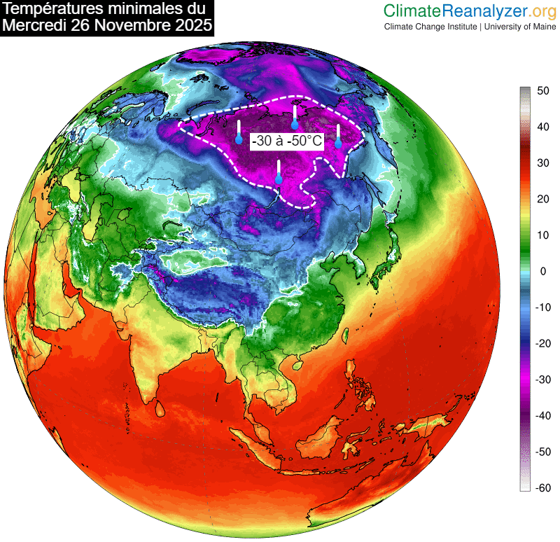 Ce mardi 25 novembre 2025 fut le premier jour de la saison à atteindre la barre symbolique des -50°C en Sibérie. On a relevé jusqu'à -50,7°C à Delyankir ! Notons aussi -50,0°C à Ust-Nera & Yurty et -49.5°C à Oymyakon. De telles valeurs se trouvent sous les normales de saison mais ne sont toutefois pas records. Dans cette région du monde au climat glacial, les normales de saison tournent plutôt autour de -40°C à cette époque de l'année.