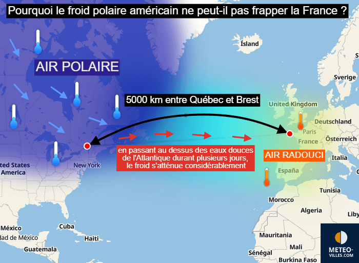 On entend souvent dire que ce qui touche l'Amérique atteint l'Europe environ deux semaines plus tard. Pourtant, cette idée très répandue est fausse, du moins en ce qui concerne le froid. Dans les faits, il n'est pas possible pour le froid polaire nord-américain d'atteindre l'Europe et l'explication principale est géographique. En effet, un océan large de milliers de kilomètres nous sépare. Or, les eaux de l'Atlantique sont relativement douces. Comme la température de l'eau de mer y est assez largement positive, le froid qui la survole s'atténue rapidement. Comme 5.000 kilomètres séparent Québec de Brest, la masse d'air a très largement le temps de se radoucir lors de son voyage au dessus de l'océan. Là est toute la différence entre le climat continental nord-américain et le climat océanique de la France.