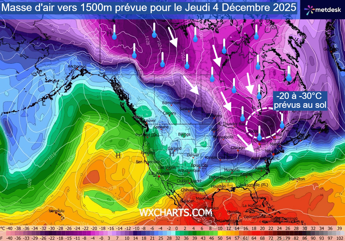 Une partie du vortex polaire se décale sur le nord du continent américain et amène un froid glacial en ce début décembre 2025. Le froid le plus intense sera atteint sur l'est du Canada et le nord-est des USA en seconde partie de semaine, en lien avec la plongée d'une masse d'air glaciale. Des valeurs atteignant -30°C à 850 hPa (soit vers 1500m) devraient survoler le Québec ! Au sol, des températures comprises entre -20 et -30°C sont modélisées sur une bonne partie du Québec le matin du vendredi 5 décembre 2025. On devrait atteindre -15 à -20°C jusque dans les États du nord-est des USA !