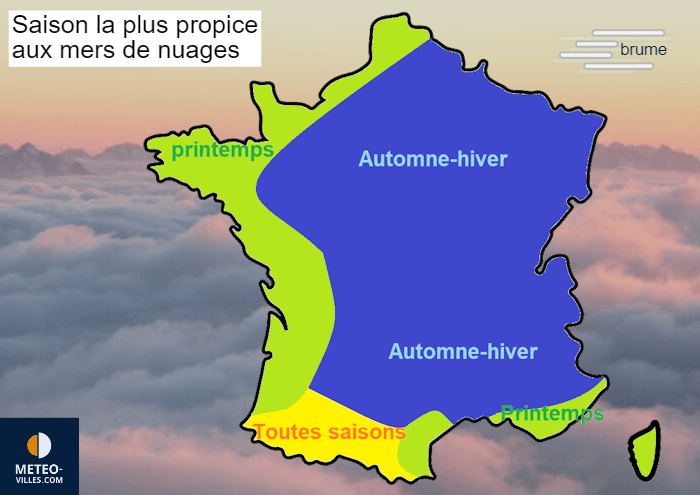 Si les mers de nuages sont possibles toute l'année, il y a des saisons bien plus favorables que d'autres à leur observation. Dans la majorité des régions de France, ce phénomène trouve son apogée entre deux mois avant et après le solstice d'hiver, lorsque le Soleil brille peu et que le sol se refroidit rapidement. Près des mers, le printemps est plus propice car l'eau est encore froide alors que l'air se réchauffe, provoquant des nuages bas, et donc des mers de nuages sur les côtes montagneuses (Pays Basque, Méditerranée, etc). Enfin, rappelons que la présence d'un anticyclone favorise grandement le phénomène.