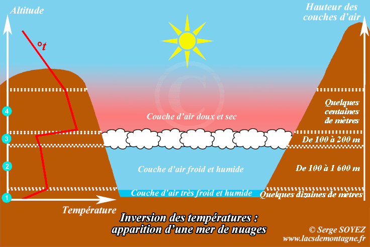 Situation météorologique d'inversion, entraînant une mer de nuages - schéma Serge Soyez, lacdemontagne.fr