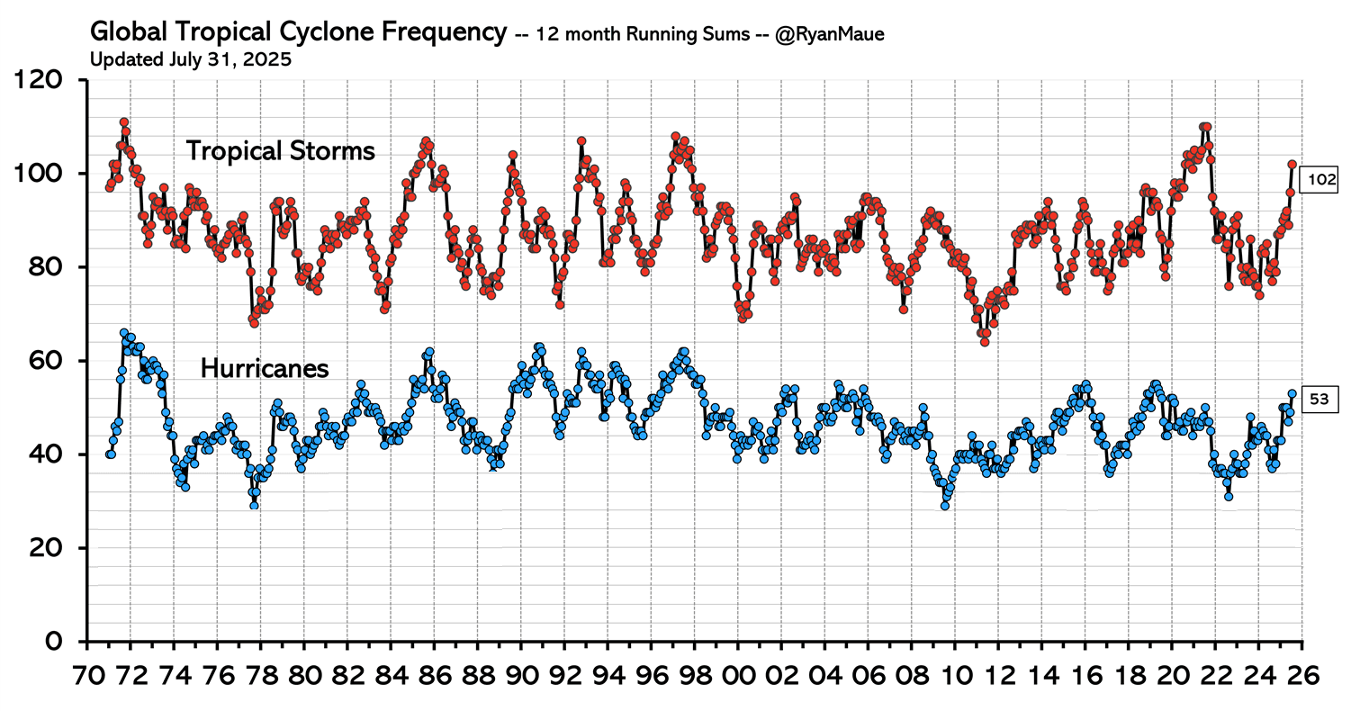 Nombre de cyclones sur Terre par an de 1970 à 2025 - via @RyanMaue
