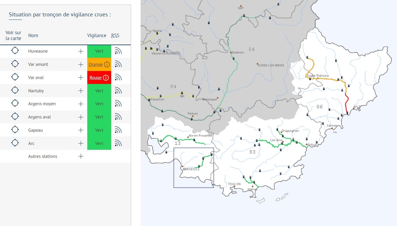 De nombreux cours d’eau sont déjà en crue, la Tinée a vu son niveau augmenter de plus de 7m durant l’après-midi avec des débordements majeurs associés. En raison de la crue des ses affluents, le Var-aval est placé en vigilance rouge par Vigicrue à 18h00, son niveau ayant augmenté de plus de 5m en 2 heures au niveau du pont Napoléon III à Nice. Les débits du fleuve s'approchent de ceux observés durant la crue exceptionnelle de 1994.