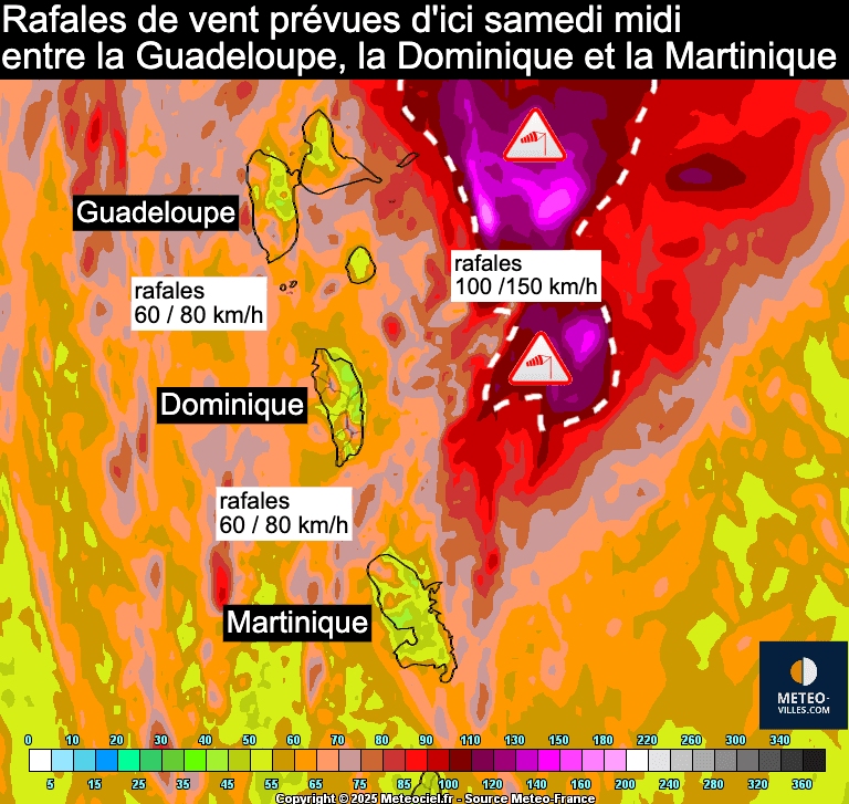 Au niveau du vent, les rafales les plus fortes resteront comme évoqué précédemment plus au large. On pourra tout de même atteindre 70-80km/h sur les reliefs et les littoraux, localement plus de 100-110km/h sur les secteurs exposés de l'est de la Guadeloupe. C'est d'ailleurs sur l'est de la Guadeloupe que la houle s'annonce la plus marquée.