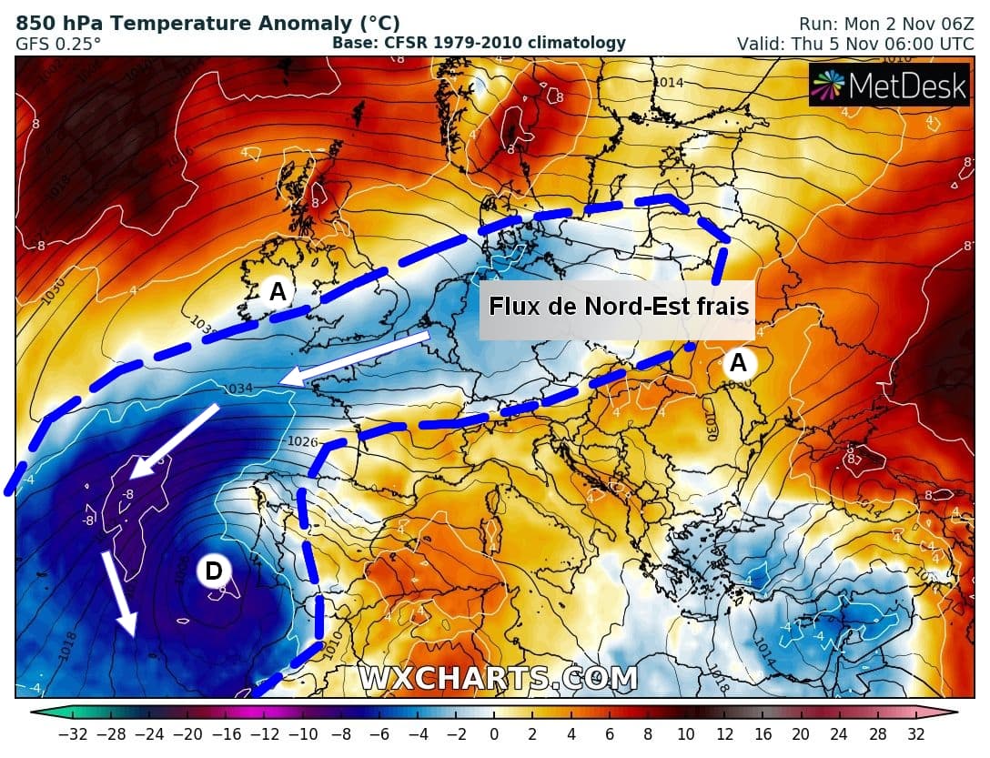 Anomalies de températures à 850hPa et isobares sur l'Ouest de l'Europe le Jeudi 5 Novembre - Modèle GFS via WX CHARTS